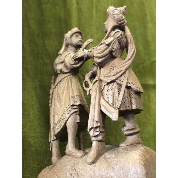 Guerriers en conflit. Éléments d'un retable du 15e siècle. Il s'agit d'un bel exemple d'histoire biblique en images, principalement réalisé en chêne, et très souvent polychrome.